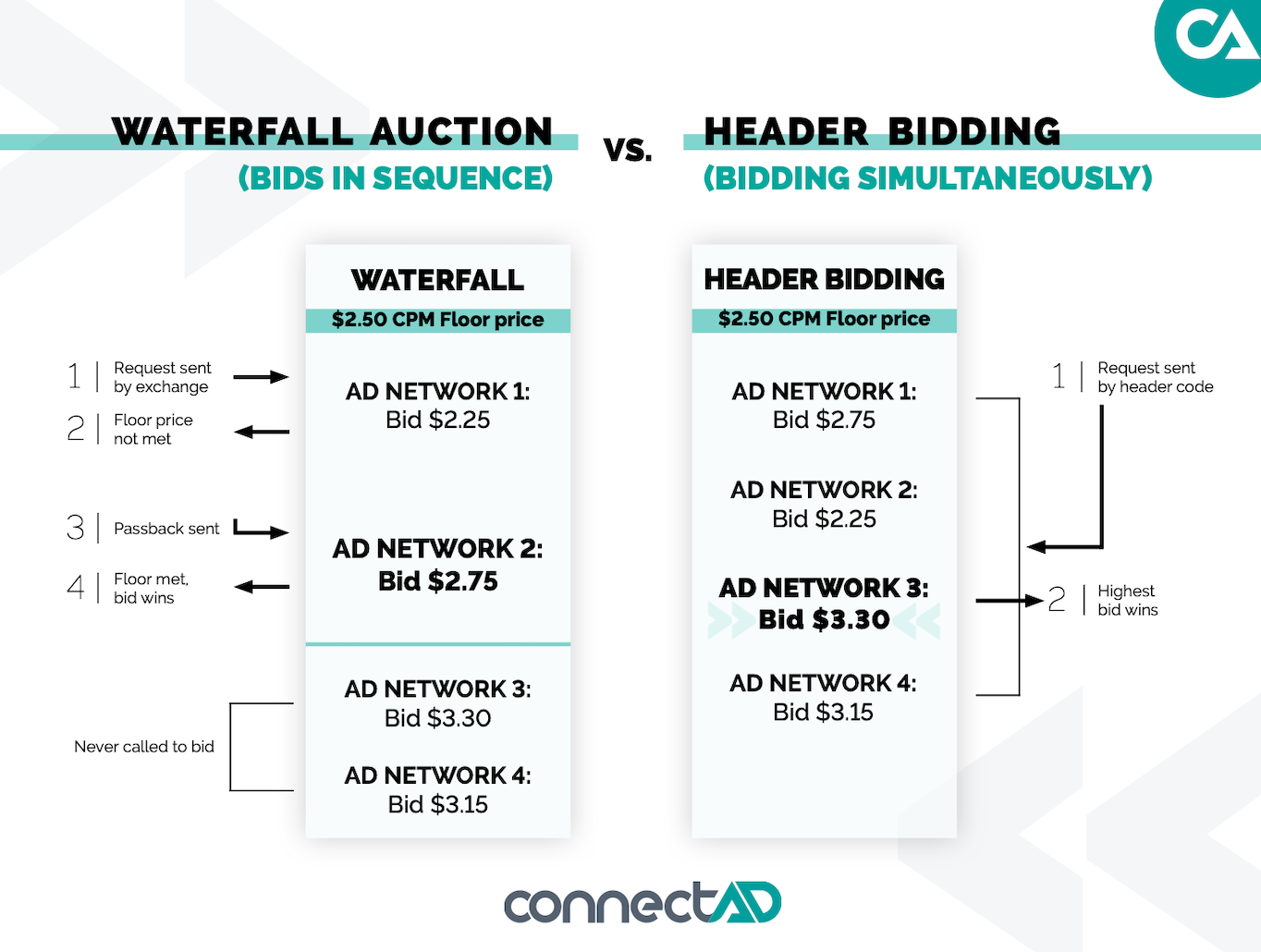반면 워터폴 방식은, 광고 인벤토리에의 입찰 기회를 "동시에" 여러 파트너사들에게 제공하지 않고, 퍼블리셔가 미리 설정한 우선순위에 따라 순차적으로 광고 네트워크에 요청을 보낸다. 주로 과거 eCPM 데이터를 기반으로 우선순위를 결정한다. 직관적으로 아래와 같은 문제점이 waterfall bidding에서 발생한다고 예상해볼 수 있다: Waterfall auction서 Ad Network 3이 Ad Network 2보다 보다 높은 입찰가를 제시함에도 불구하고, Waterfall에서는 Ad Network 3까지 기회가 가지 않는다.