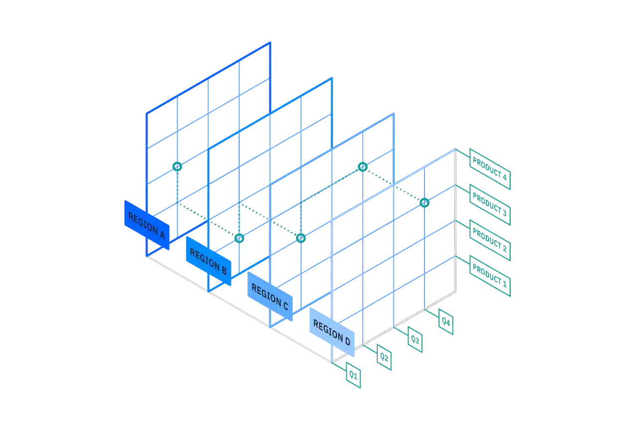 OLAP을 OLAP이게 하는 핵심. 빠르게 다차원 데이터를 질의하고 분석할 수 있도록 한다. 데이터 볼륨이 커질수록 속도와 효율성이 떨어지는 row-by-column 2차원 테이블인 RDB에 비해 대용량 데이터의 분석에 강점을 가지고 있다. 이를테면 region이라는 단위의 분석에서 시도 / 시군구 / 읍면동 이런 식으로 drill-down이 가능할 뿐 아니라 기간도 연/분기/월 등의 단위로 나누어, 이들을 자유롭게 조합할 수 있다는 개념. drill-down 뿐 아니라 아래 여러 개념을 포괄한다.